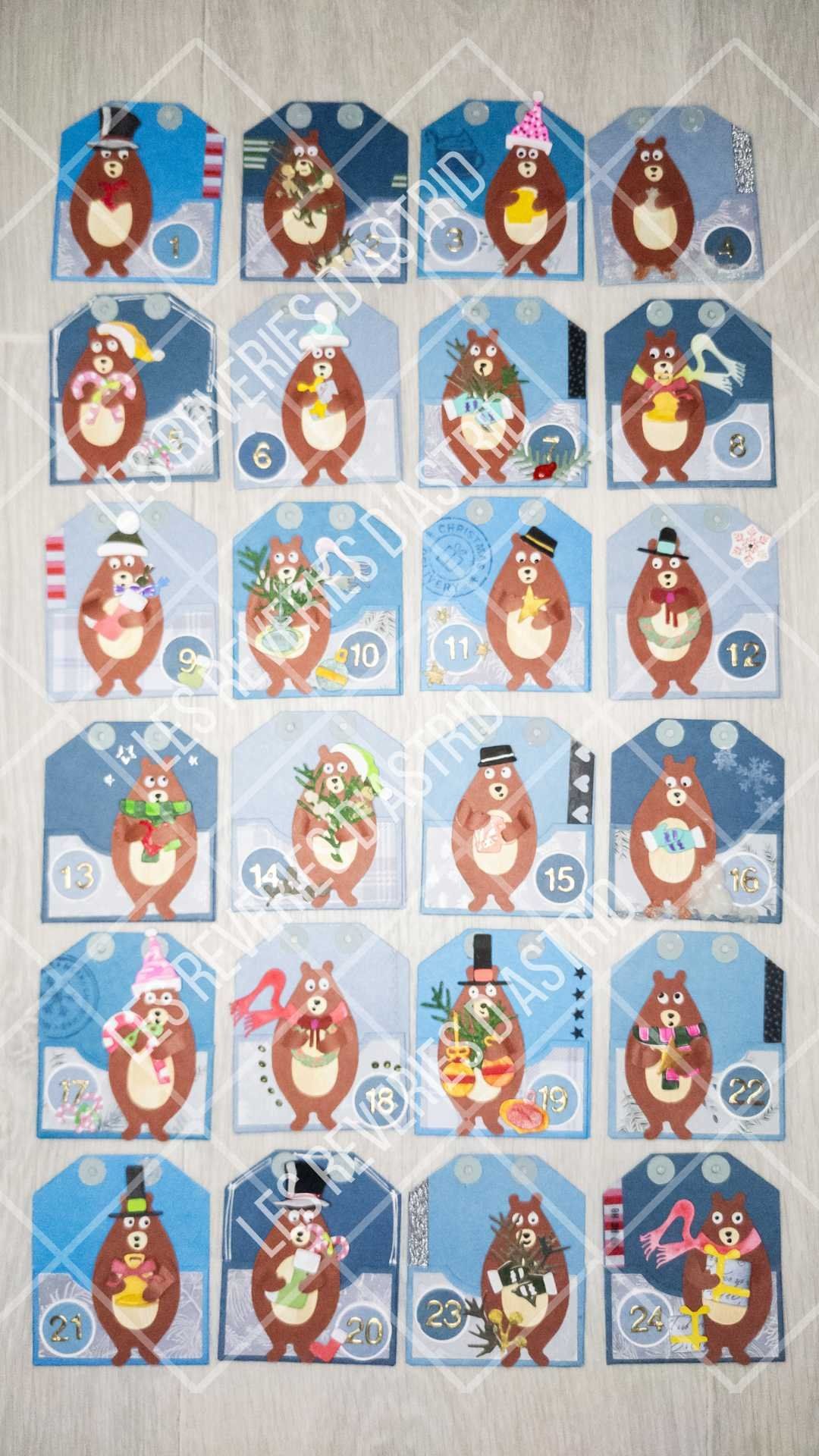 - un ruban sur lequel sont fixé les 24 cartes et qui permet ensuite d'accrocher le calendrier sur le sapin, un mur, etc.
